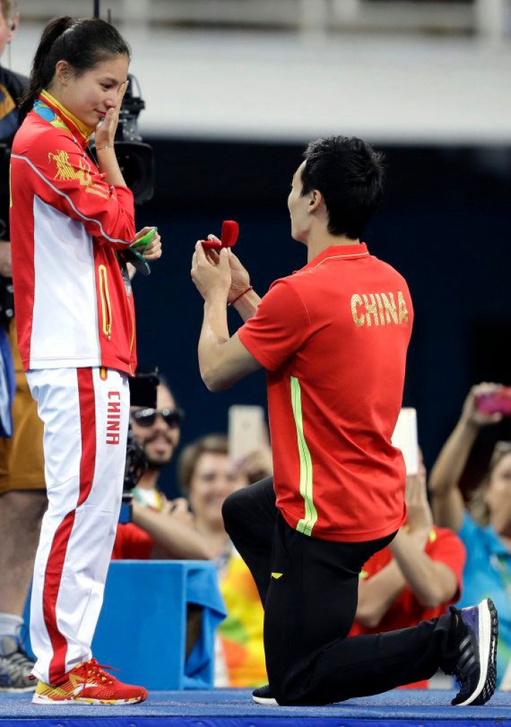 La atleta china He Zi no esperaba que al bajar del podio, al que había subido para celebrar su medalla de playa por la prueba de 3 metros de trampolín, iba a encontrarse con una propuesta de matrimonio de su novio, el también saltador Qin Kai.