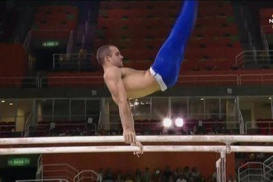 El gimnasta estadounidense Danell Leyva logró este miércoles la medalla plata en la final de la prueba de barras paralelas. Pero antes de realizar su rutina, protagonizó un espectáculo que encandiló a gran parte del público: se subió a las barras e hizo una serie de ejercicios sin camiseta.
