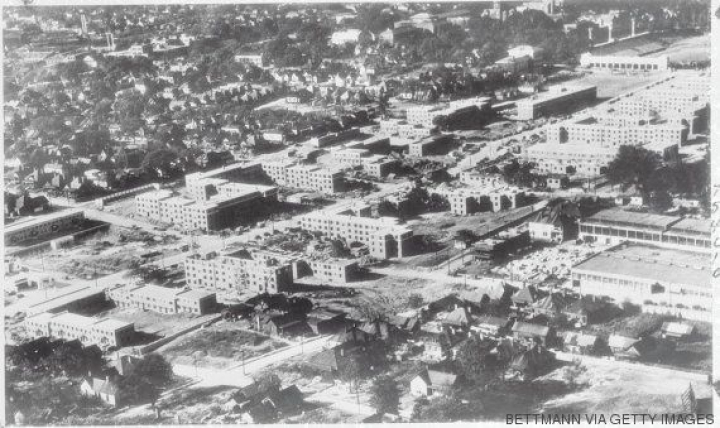 El presidente Franklin Delano Roosevelt inauguró Techwood Homes en 1935, como el primer proyecto de viviendas públicas subvencionadas por un estado federal de Estados Unidos.
