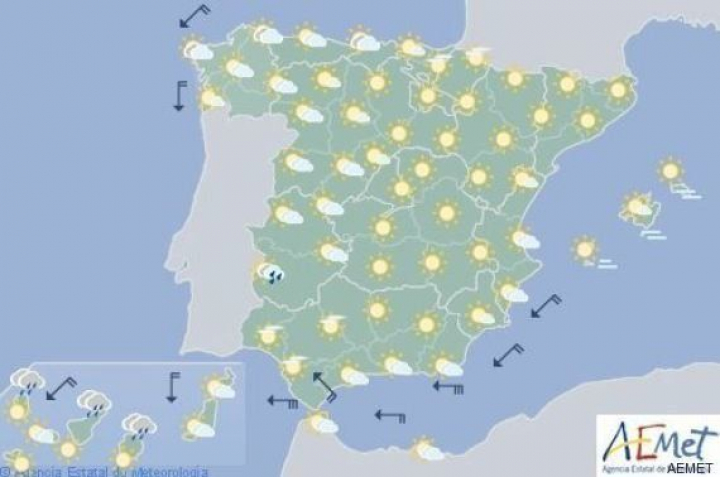 Por la tarde pueden extenderse, aunque ya con baja probabilidad, a puntos dispersos del resto de la mitad occidental peninsular. Habrá intervalos nubosos en el norte de las Canarias, donde puede desprenderse alguna lluvia ocasional.