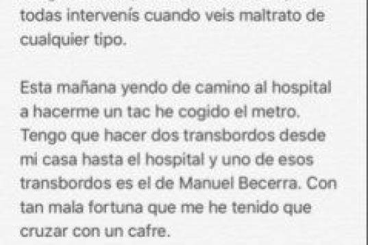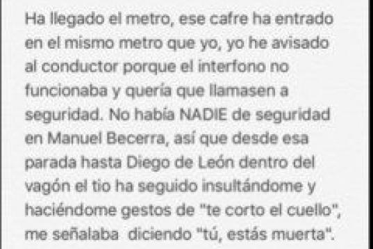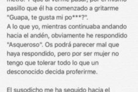La mujer ha redactado una mala experiencia que ha tenido por la mañana, cuando se dirigía al hospital a hacerse una resonancia. La joven ha sido vejada e insultada por un señor en el metro de Madrid, que según cuenta la propia afectada estaba "haciendo sus necesidades" en el vagón.
