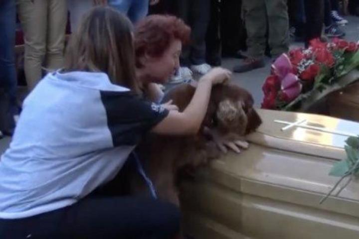 Un perro se despide de su dueño fallecido en el terremoto de Italia durante el funeral