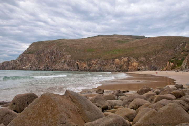 PLAYA DO CASTRO (Ortigueira, A Coruña). Aquí la vegetación más baja acaba abruptamente en profundos acantilados y las grandes rocas salpican la arena y se adentran en el mar. Impresionante.