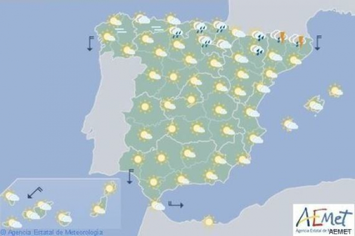 También habrá nubosidad de evolución en los entornos montañosos del tercio este, sin descartar chubascos, en general aislados, acompañados de tormenta en el Sistema Ibérico oriental y también, siendo más probables y pudiendo ser localmente fuertes, en Pirineos.