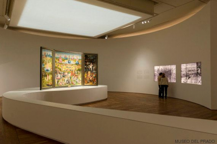 No es diferente en esta ocasión, aunque sí varía la forma de presentarse. El museo del Prado permite darle la vuelta a cada uno de sus trípticos, incluido El Jardín de las Delicias, de modo que puede verse el dibujo trasero de las alas. Además, en la parte de atrás de la tabla central de cada tríptico se ha dibujado una imagen suavizada de cómo sería el cuadro cerrado para que los visitantes puedan hacerse a la idea.