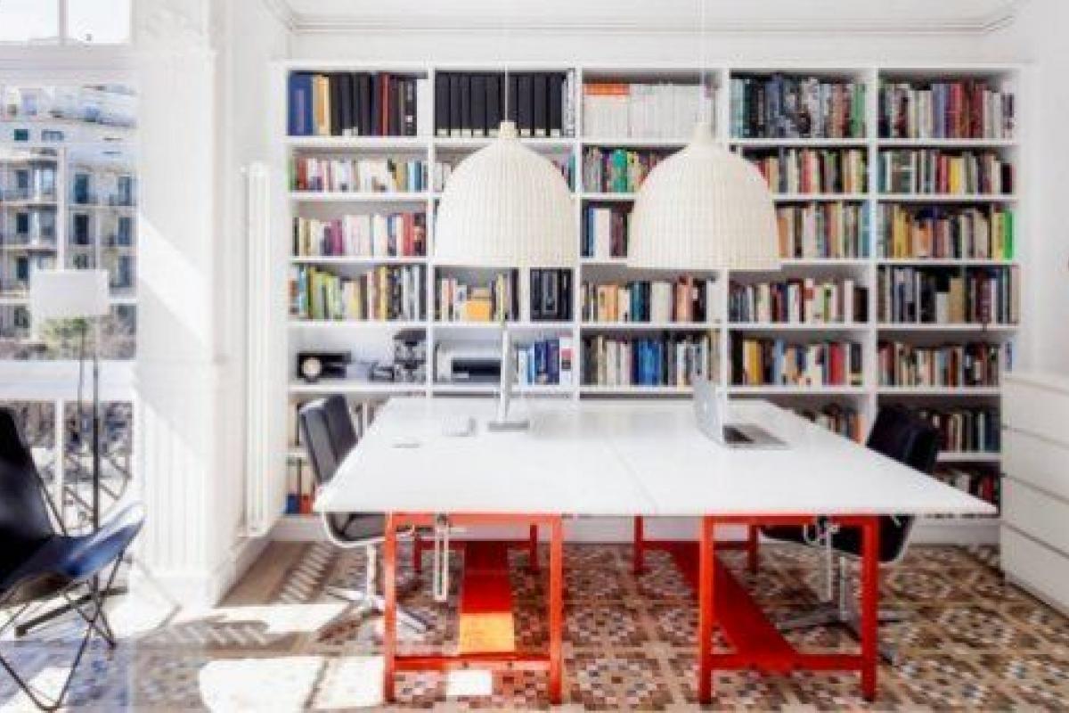 Si el trabajo es de jornada completa, será mejor si dispones de una habitación independiente: estarás más aislado de los ruidos domésticos. Si la única opción es el salón, divide el espacio, situándote en uno de los extremos. Lo puedes hacer con un cerramiento de vidrio, con puertas correderas o con muebles divisorios.