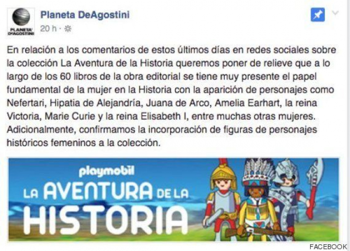 Mejor tarde que nunca. La editorial Planeta DeAgostini, que ha sido criticada durante los últimos días por lanzar una colección de Playmobil de personajes de la historia en la que no había ninguna mujer, ha rectificado e incluirá figuras de personajes históricos femeninos.