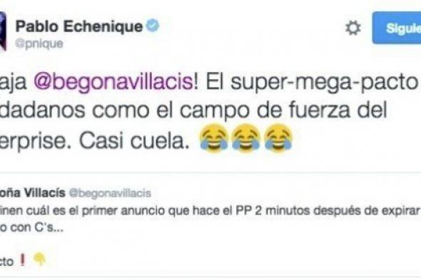 Begoña Villacís, portavoz de Ciudadanos en el Ayuntamiento de Madrid, criticó en Twitter al Gobierno del Partido Popular por proponer al exministro José Manuel Soria para un cargo en el Banco Mundial, nada más expirar el pacto de investidura entre ambas formaciones. El secretario de organización de Podemos, Pablo Echenique se río en la misma red social del comentario de la dirigente naranja. La bronca estaba servida.