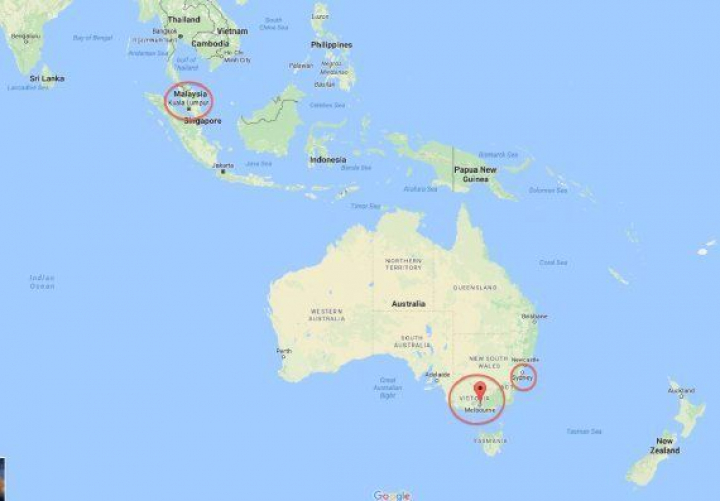 El aeropuerto de Melbourne está situado a 722 kilómetros al suroeste de Sidney, mientras que Kuala Lumpur está 6.611 kilómetros al noroeste.