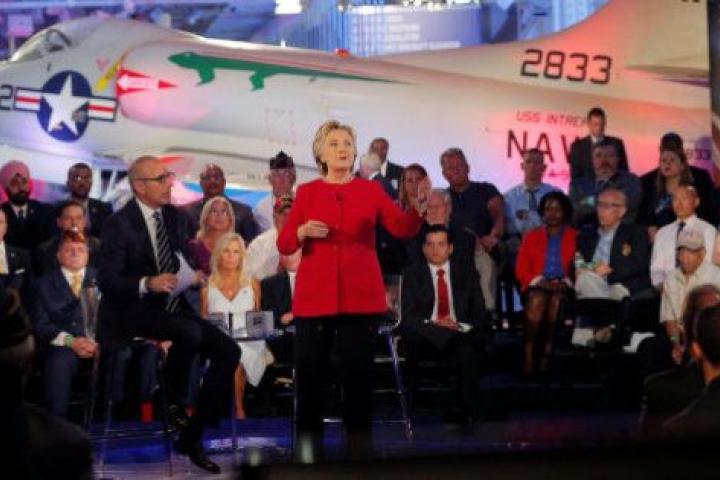 Las ideas, que no pudieron ser contrastadas porque primero habló Clinton y a continuación Trump, fueron defendidas a bordo del portaaviones "Intrepid", que dejó de operar en 1974, anclado a orillas del río Hudson y que sirve como museo naval en esta ciudad.