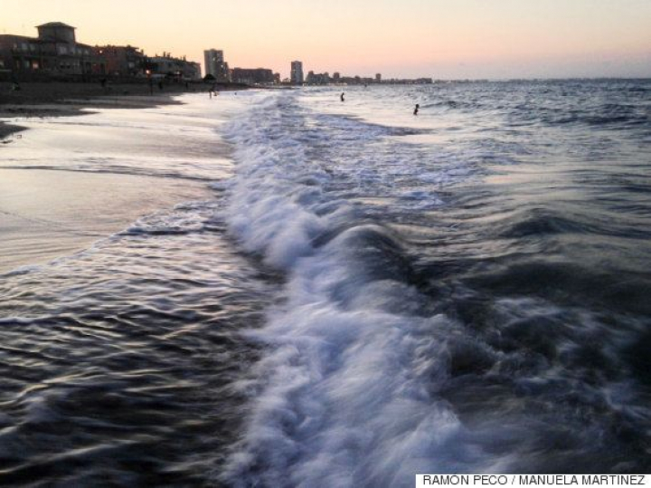 La playa de Levante al atardecer con los rascacielos de la Manga al fondo.