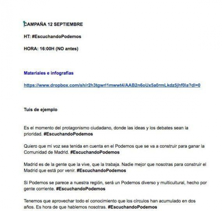 La presentación de la plataforma de Espinar en redes sociales no ha sido precisamente plácida. Su equipo ha enviado a través de Telegram un mensaje con un enlace a un documento de Google donde se especificaba la hora de lanzamiento de la campaña, un enlace a materiales e infografías y "tuis (sic) de ejemplo".