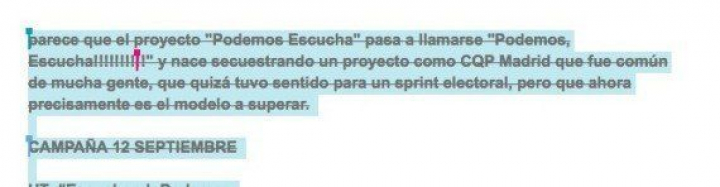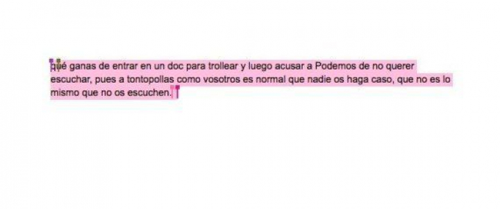 El problema es que ese documento estaba abierto a la edición de quienes entraban a verlo y algunos han comenzado a escribir insultos como "monguers", a borrar lo que había escrito y a acusar a la plataforma de Espinar de haber "robado" la cuenta de Claro Que Podemos Madrid en Twitter. Aquí puedes ver las capturas:
