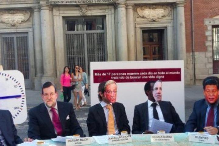 Su concentración no ha podido ser más explícita: han representado a alguno de los principales líderes del mundo con caretas y trajes, reunidos en torno a una mesa, y ante la presencia de un reloj y una pancarta con el lema ‘Líderes mundiales, su tiempo se acaba’. Junto a esta representación, las 17 organizaciones se han dirigido por carta tanto al Gobierno como al rey -que representará a España ante la ONU- para que España se comprometa pública y proactivamente con la futura adopción de un acuerdo que garantice la responsabilidad compartida entre los Estados sobre las personas refugiadas y migrantes y les presentan una serie de medidas que es urgente poner en marcha.