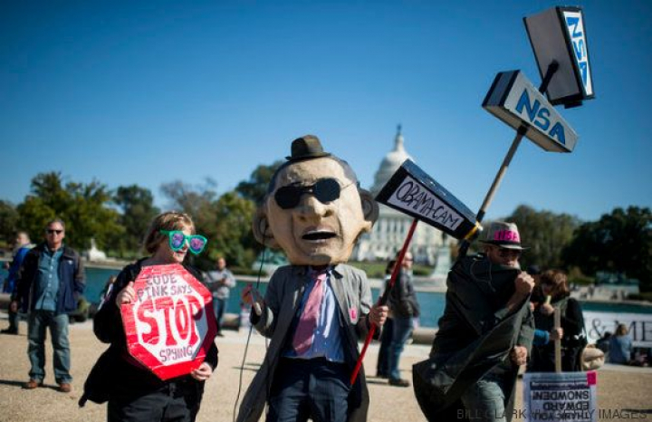 Un grupo en contra de la vigilancia de la Agencia de Seguridad Nacional estadounidense (NSA) se manifiesta en Washington para oponerse a la vigilancia por parte del Gobierno de la actividad 'online' y de las llamadas telefónicas.