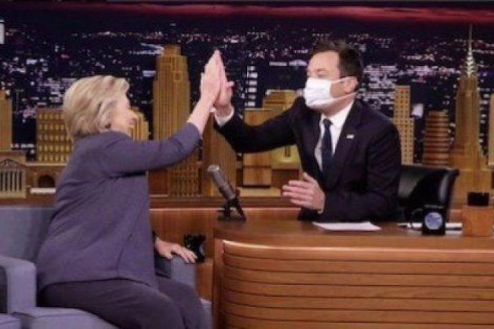 "Bienvenida, bienvenida", le dijo Fallón a Clinton, mientras el cómico se ponía una mascarilla. La exsecretaria de Estado rompió a reír y le puso la mano a Fallon para que chocara los cinco. El presentador lo hizo, pero acto seguido sacó un bote de desinfectante de manos y, mientras hablaba, con la candidata demócrata se lavó las manos.