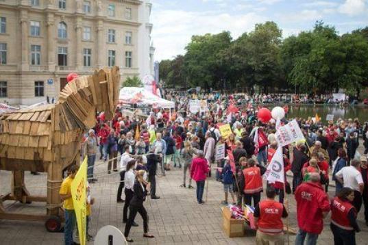 "STOP CETA - STOP TTIP" o "Personas antes que beneficios" eran algunos de los lemas recogidos en la concentración de Berlín. También ha habido concentraciones en otras ciudades como Viena, Salzburgo, Gotemburgo o Estocolmo.