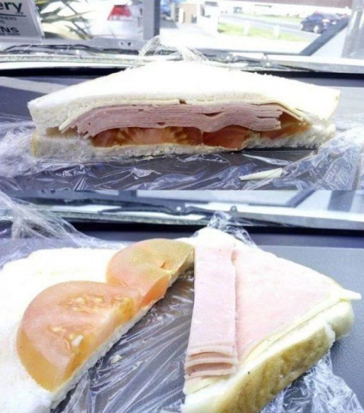En la parte superior se ve un sándwich de apariencia normal e incluso apetecible: con unas porciones generosas de tomate, jamón y queso. Pero, justo debajo, se aprecia la verdad del bocadillo. Todos los ingredientes están colocados estratégicamente para que parezca que lleva mucha comida pero, en realidad, apenas hay dos lonchas entre pan y pan.