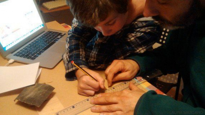 El hijo de Laura Mascaró hace un proyecto de carpintería con su padre.