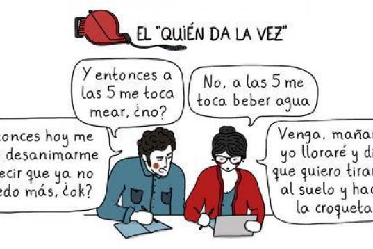 Algo sabe de todo esto Mamen Jiménez, que además de psicóloga especializada en pareja y sexología, con una buena cantidad de situaciones en su consulta, fue madre de un hijo hace tres años, por lo que ella misma (y su pareja) han pasado por muchas de estas situaciones. Tantas que decidió crear un blog para recoger todo lo que había pasado y para plasmar muchas de las vivencias que veía en sus pacientes. Y ahora esa bitácora se ha convertido en un libro, Amor con ojeras (Editorial Lunwerg), que narra todo lo que vive una pareja tras tener un hijo y que sale a la venta este 27 de septiembre. Para darle más gracia al asunto, los textos están acompañados de divertidas viñetas hechas por ella misma. "En el primer año, con tanto sueño, lo de los dibujitos ayuda mucho", ríe Jiménez divertida en una entrevista telefónica a El Huffington Post.