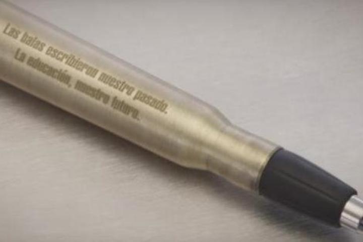 Cada pieza, una bala calibre 50 transformada en bolígrafo, lleva grabada la frase "Las balas escribieron nuestro pasado. La paz, nuestro futuro".
