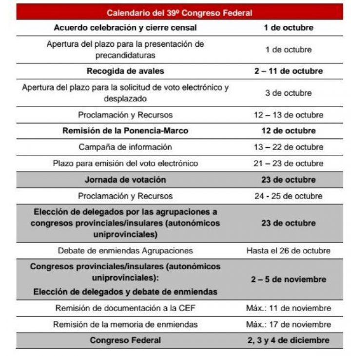 Los siguientes pasos serían la celebración de los llamados ‘congresillos’, es decir la elección de los delegados de las federaciones. Este proceso tenía antes vital importancia, pues eran ellos los que votaban al secretario general. Esta fórmula fue abolida en la anterior edición para dar voz a todos los militantes. Eso sí, servirá para medir las fuerzas internas de cada facción.