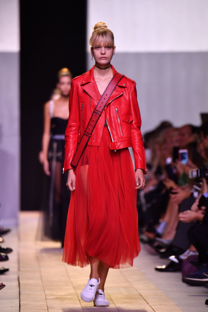 La colección primavera-verano 2017 de Chiuri estuvo cargada de energía: una decena de modelos en blanco abrieron el desfile en looks inspirados por la vestimenta de los tiradores de esgrima, con chaquetas blancas acolchadas acompañadas por pantalones a media pierna o largas faldas de tul. Para la noche, el blanco se convirtió en negro y la tela en cuero, siguiendo ese mismo efecto acolchado y con algunas decoraciones divertidas como parches en forma de corazón, así como vestidos rojos, también en tul.