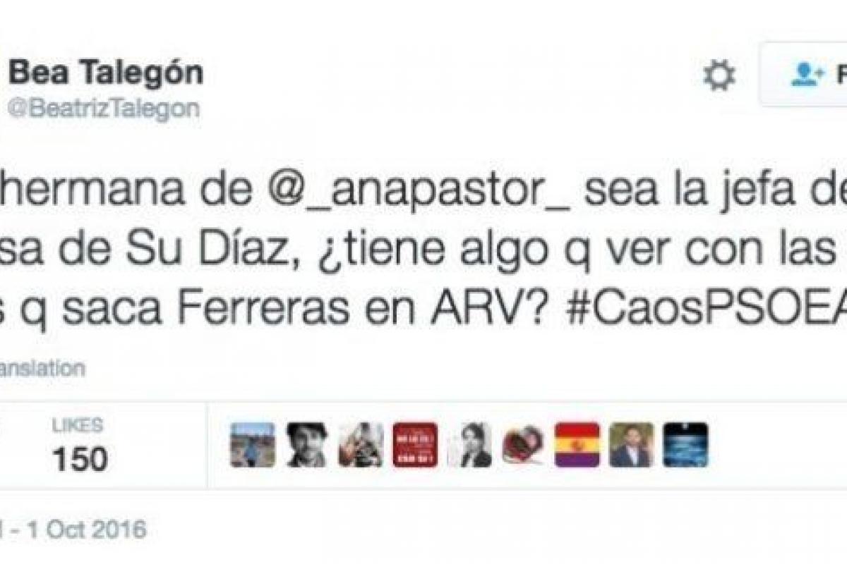 La periodista de LaSexta Ana Pastor ha salido al paso de las insinuaciones que ha realizado en Twitter la exdirigente socialista Beatriz Talegón a través de esta red social.