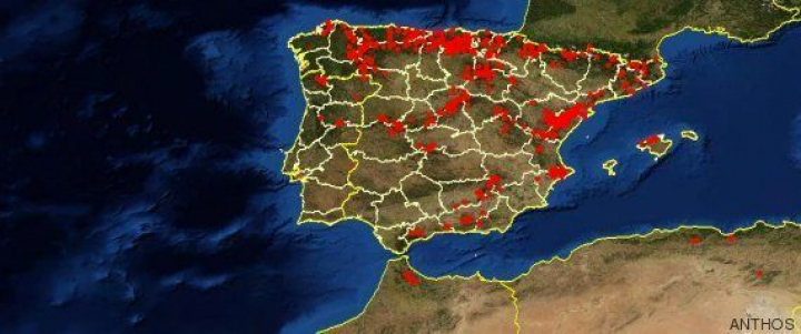 Mapa de Anthos de la distribución geográfica del tejo en España.
