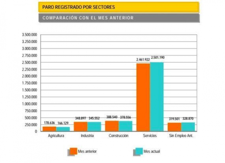 La subida se ha notado sobre todo en el sector servicios (+39.268 desempleados) y en el colectivo sin empleo anterior (+9.369). Pero hay sectores en los que el paro ha bajado: agricultura (-12.507 desempleados), construcción (-9.984) e industria (-3.345).