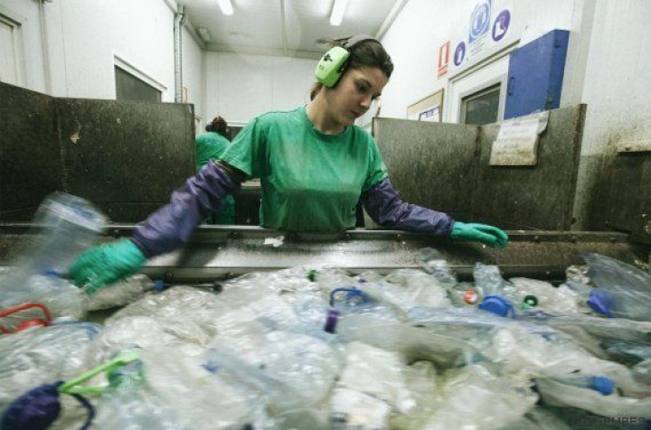 Una trabajadora separa los envases de plástico PET extraído del mar