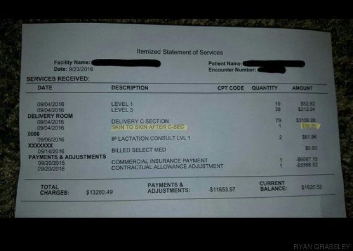 Grant escribió la publicación de Facebook después de que Ryan Grassley y su mujer recibieran esta factura del hospital tras el nacimiento de su segundo hijo. En la factura podía leerse que les habían cobrado casi 40 dólares por haber mantenido contacto piel con piel con su hijo recién nacido.