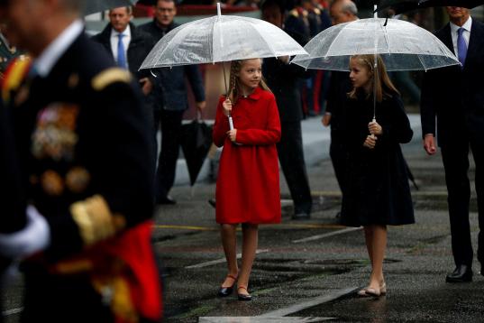 Leonor lleva un abrigo azul y Sofía uno rojo, los colores característicos de la izquierda y la derecha en España pero andan juntas y bien avenidas bajo paraguas transparentes. ¿Coincidencia?