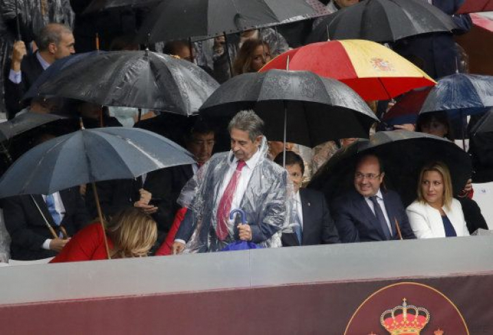 Pero hay alguien cuya vestimaneta tampoco ha pasado desapercibida y menos para los internautas que no han tardado en utilizar su humor en Twitter para dar de sí lo máximo posible al look. Se trata de Miguel Ángel Revilla, presidente de Cantabria, que parece que ha hecho caso al refrán "ande yo caliente, ríase la gente" y, mientras todos los que se estaban a su alrededor aguantaban bajo la lluvia con pesados -y vistosos paraguas- o incluso mojándose la cabeza para lucir sus trajes, Revilla ha tirado de su experiencia cántabra y se ha puesto un chubasquero transparente como los que reparten en el parque de atracciones.