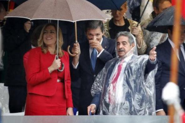Pero hay alguien cuya vestimaneta tampoco ha pasado desapercibida y menos para los internautas que no han tardado en utilizar su humor en Twitter para dar de sí lo máximo posible al look. Se trata de Miguel Ángel Revilla, presidente de Cantabria, que parece que ha hecho caso al refrán "ande yo caliente, ríase la gente" y, mientras todos los que se estaban a su alrededor aguantaban bajo la lluvia con pesados -y vistosos paraguas- o incluso mojándose la cabeza para lucir sus trajes, Revilla ha tirado de su experiencia cántabra y se ha puesto un chubasquero transparente como los que reparten en el parque de atracciones.