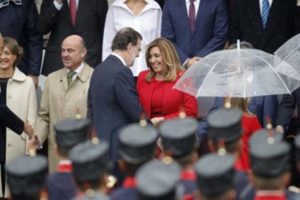 Era una de las imágenes más esperada del desfile. La del presidente del gobierno, Mariano Rajoy, y la presidenta de la Junta de Andalucía, Susana Díaz, después de que ésta consiguiera desbancar a Pedro Sánchez como secretario general del PSOE, en el Comité Federal más surrealista que se recuerda.