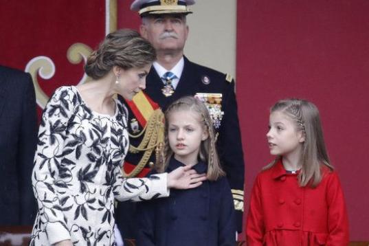 La reina Letizia estrenó vestido para la ocasión. No innovó en diseñador: la creación era obra de su modisto de casi cabecera, Felipe Varela, que la viste para buena parte de sus actos. En esta ocasión, el diseño era un abrigo vestido en tweed blanco roto con bordados a mano en negro en forma de flores en cristal y georgette. Los zapatos, en ante beige, eran de la firma Magrit, y el bolso era una cartera de mano a juego con los mismos. Para su 13º desfile del Día de la Hispanidad, Letizia también lució unos pendientes de diamantes y perlas australianas que el rey Felipe le regaló cuando nació su hija mayor, la princesa Leonor.