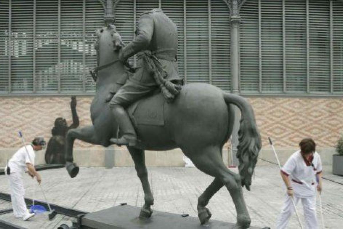 Es solo una de las piezas de la exposición "Franco, Victoria, República. Impunidad y espacio urbano" que se ha inaugurado esta tarde en el Born de Barcelona. Pero no es una pieza cualquiera: esta estatua ecuestre de Franco sin cabeza ha provocado un enorme revuelo en la Ciudad Condal.