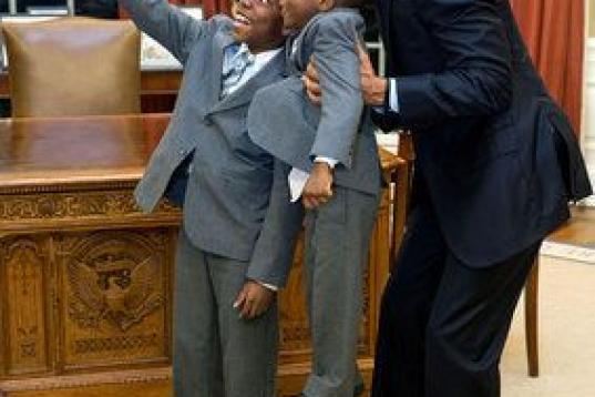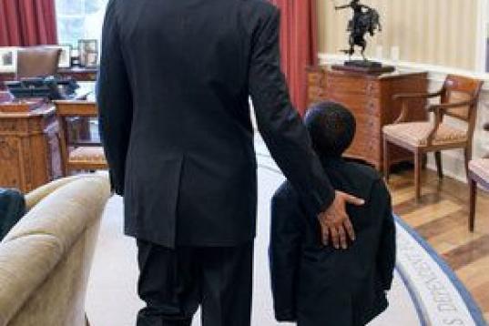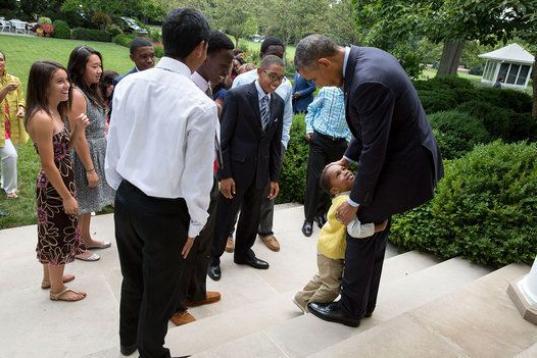 "Four-year-old Malik Hall greets the President, almost in disbelief, before a departure photo with Malik's uncle Maurice Owens, center, and his family." (Official White House Photo by Pete Souza)
