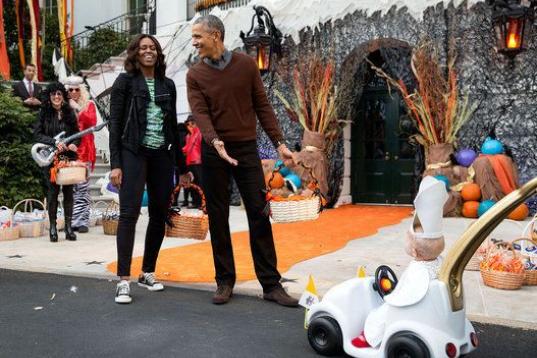 "The President and First Lady react to a child in a pope costume and mini popemobile as they welcomed children during a Halloween event on the South Lawn of the White House." (Official White House Photo by Pete Souza)