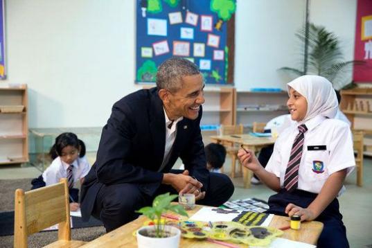 "The President talks with a young refugee at a Dignity for Children Foundation classroom in Kuala Lumpur, Malaysia. She was working on a painting." (Official White House Photo by Pete Souza)