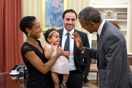 President Barack Obama holds up four-month-old Alia Jawando as her father, William Jawando, Deputy Associate Director of Public Engagement, and her mother Michele look on in the Oval Office, March 9, 2011. (Official White House Photo by Pete Souza)