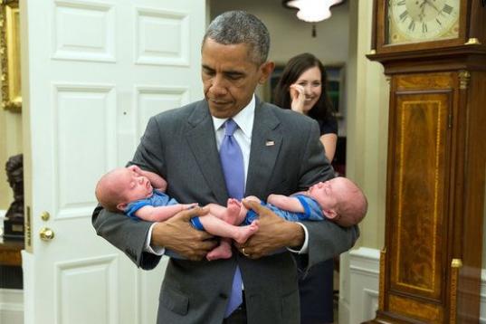 "The President carries the twin boys of Katie Beirne Fallon, Director of Legislative Affairs, into the Oval Office just a few months after they were born." (Official White House Photo by Pete Souza)