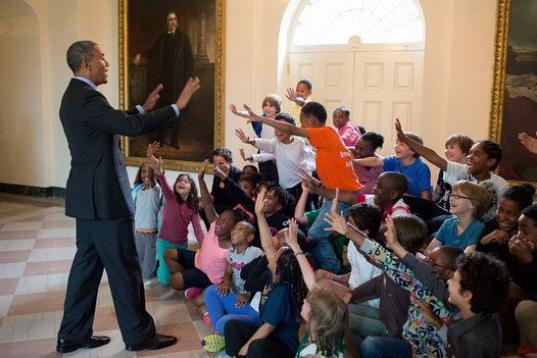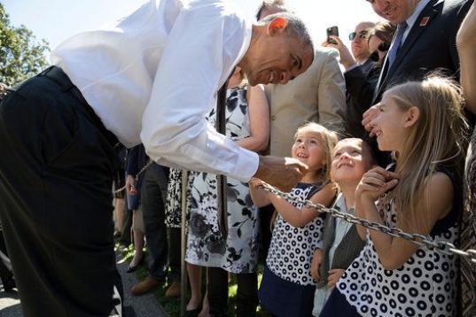 President Barack Obama greets children at a day care facility adjacent to daughter Sasha's school in Bethesda, Md., following her 4th grade closing ceremony, June 9, 2011. (Official White House Photo by Pete Souza)