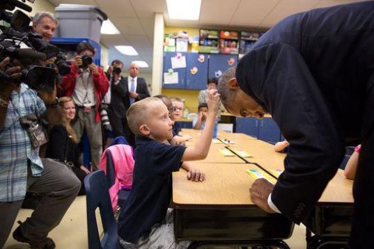 President Barack Obama allows first grader Edwin Caleb to touch his hair during a classroom visit at Clarence Tinker Elementary School at MacDill Air Force Base in Tampa, Fla., Sept. 17, 2014. (Official White House Photo by Lawrence Jackson)
