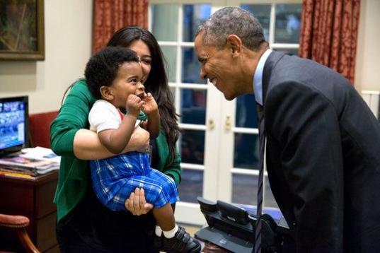 President Barack Obama greets a little boy held by Ferial Govashiri, Personal Aide to the President, in the Outer Oval Office, Oct. 24, 2014. (Official White House Photo by Pete Souza)