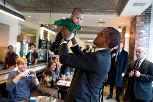 President Barack Obama lifts a baby while greeting patrons prior to lunch at The Coupe restaurant in Washington, D.C., Jan. 10, 2014. (Official White House Photo by Pete Souza)