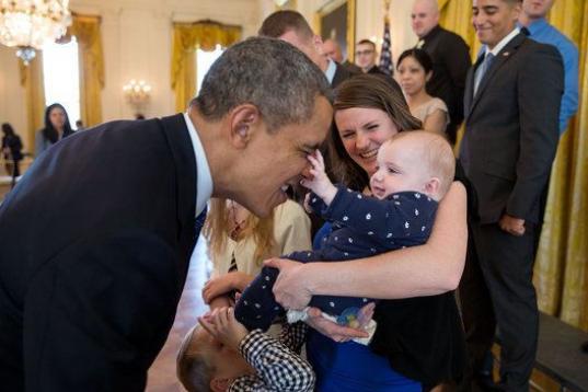 "The President greets nine-month-old Josephine Gronniger, whose father, Tim Gronniger, brought his family by the Oval Office for a family photo." (Official White House Photo by Pete Souza)