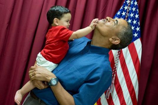 President Barack Obama blocks the sun from a baby's face as he visits with guests following the eighth annual Wounded Warrior Project's Soldier Ride on the South Lawn of the White House, April 16, 2015. (Official White House Photo by Pete Souza)
