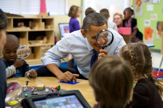 "The President genuinely enjoys being with kids. Here, he played a magnifying glass game with children during a visit to a pre-kindergarten classroom at the College Heights Early Childhood Learning Center in Decatur, Georgia."